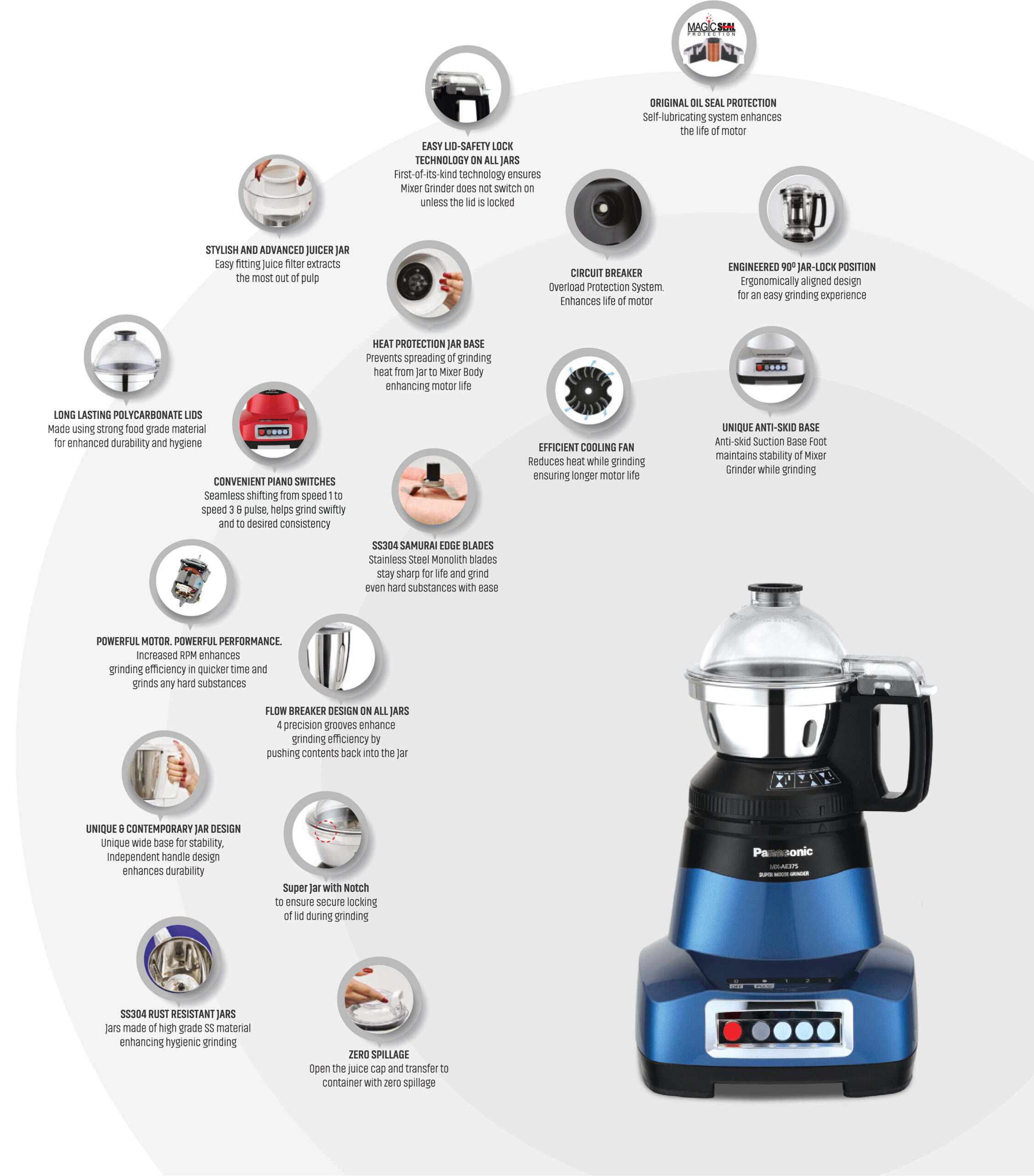Simplify grinding, juicing, and blending with Panasonic’s Monster Super Mixer Grinders. Enjoy superior performance with a super jar that comes with three lids to suit your varied needs, and an extra-wide stainless steel blade that ensures effortless grinding of any texture. From powdery spice mixes to chunky chutneys, fresh juices to thick batters — perfect every consistency with precise grinding.