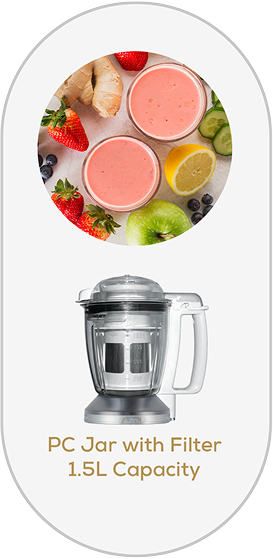 The PC Juicer Filter Jar's built-in filter and wide spout, filters, processes, and pours fresh juice in seconds. (On selective model)
