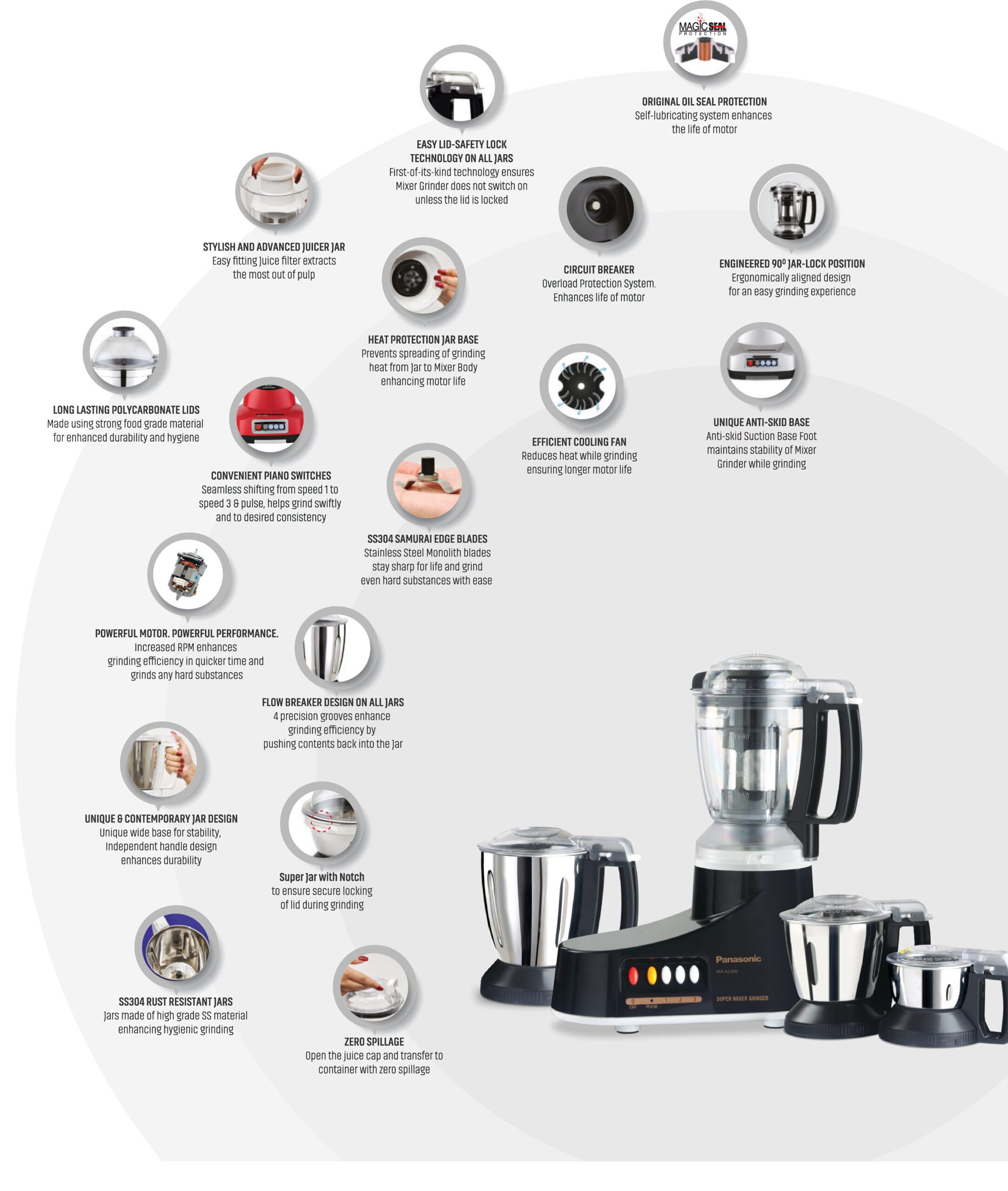The Signature series of Super Mixer Grinders by Panasonic comes with multiple jars ensuring signature performance. The series also comes in a variety of shades that you can choose from. With features like easy lid safety lock, copper motor, rust resistance, and cooling fan, enjoy powerful performance at the touch of a switch. Be assured of signature grinding, blending, juicing and milling that brings the best out of your signature flavours and dishes.